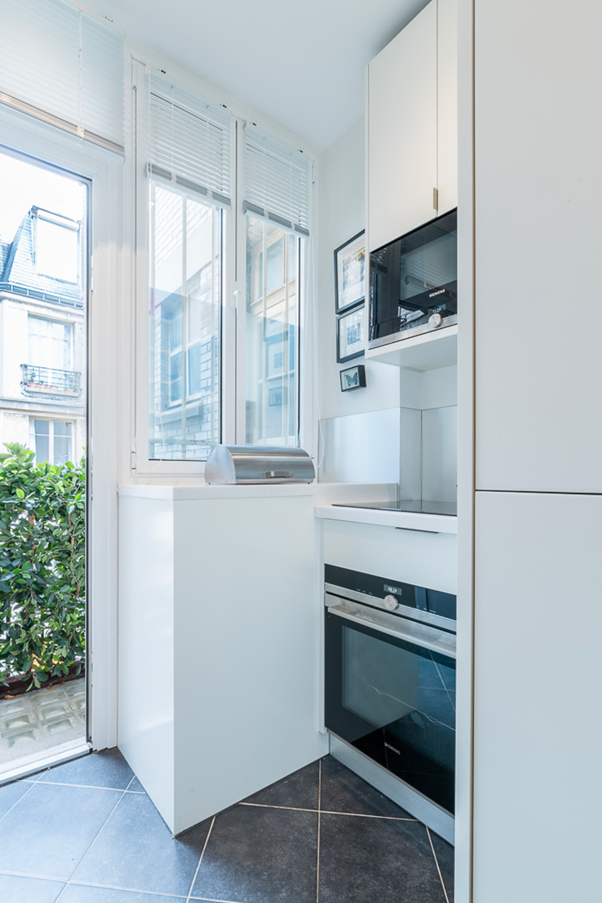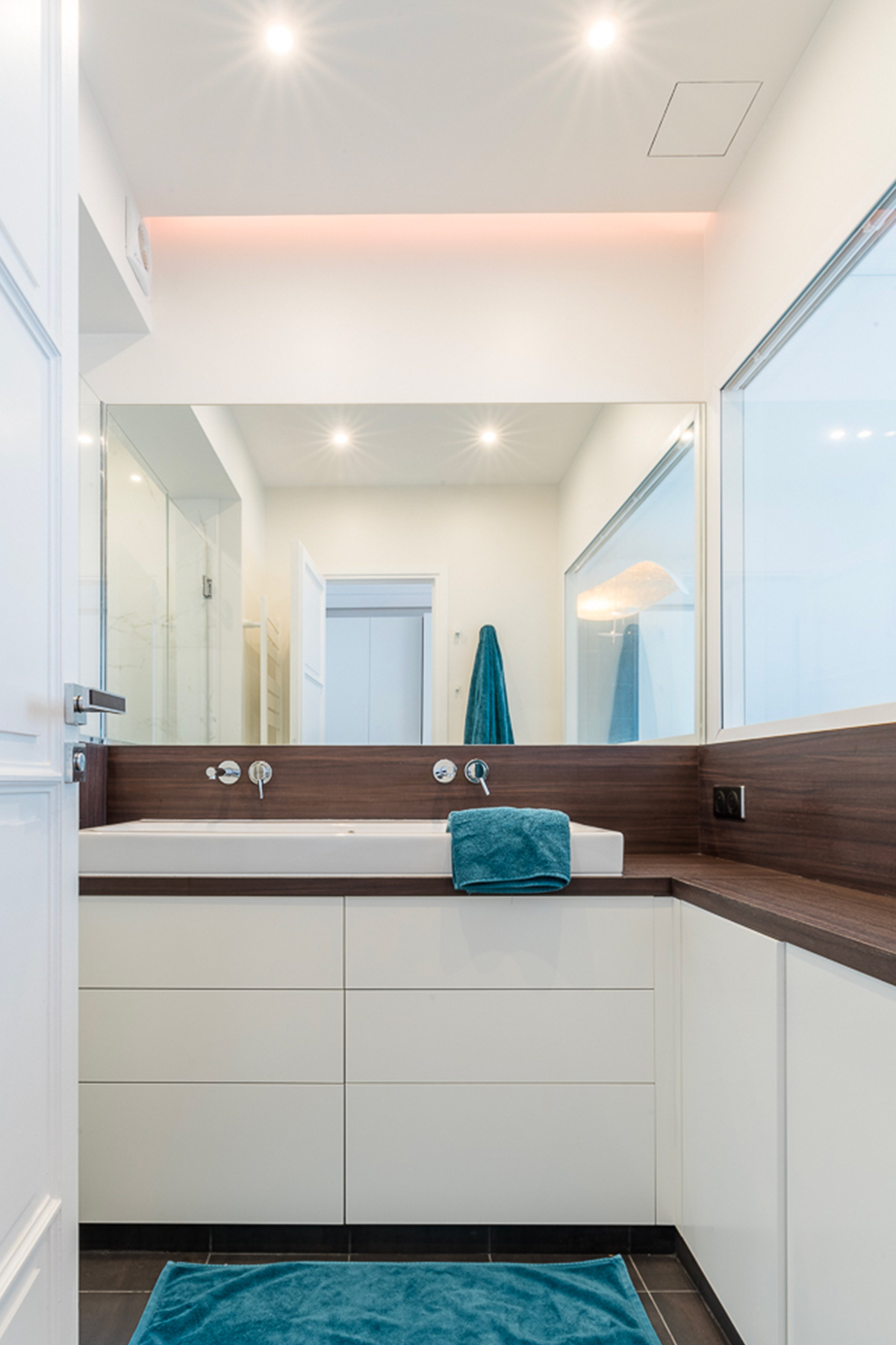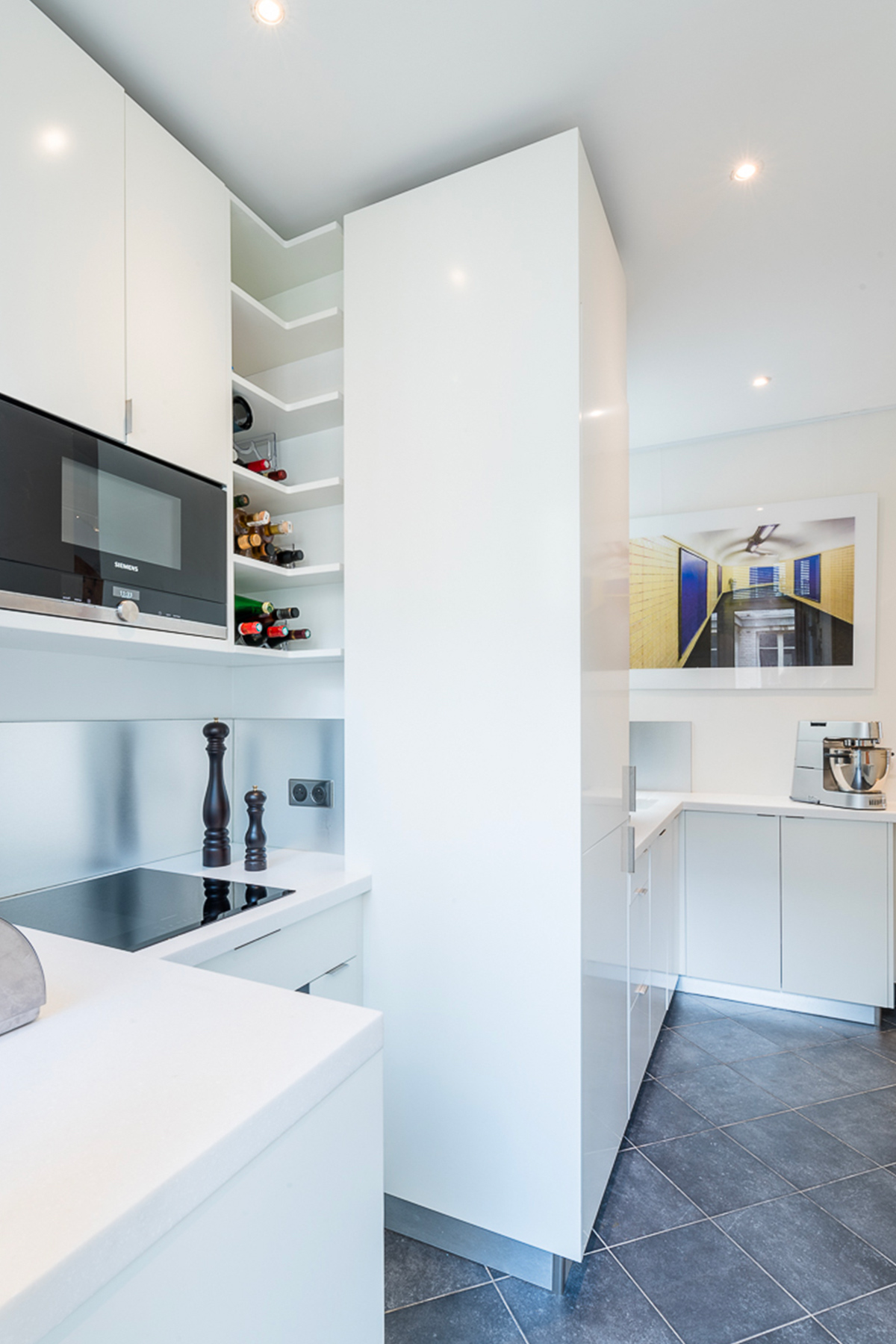 Jeu de contrastes blanc et noir, aussi choix de revêtements sobres et élégants (placages de bois foncé, carrelages façon marbre, panneaux laqués, …).