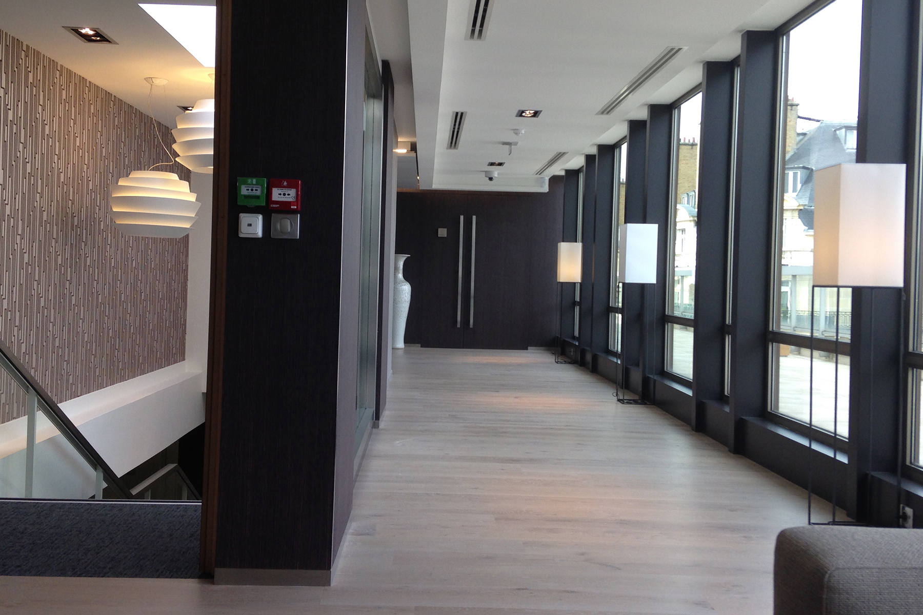 Choix de revêtements authentiques (placages de bois foncé, parquet teinté, grès cérame, …), pour créer une ambiance feutrée et confidentielle.