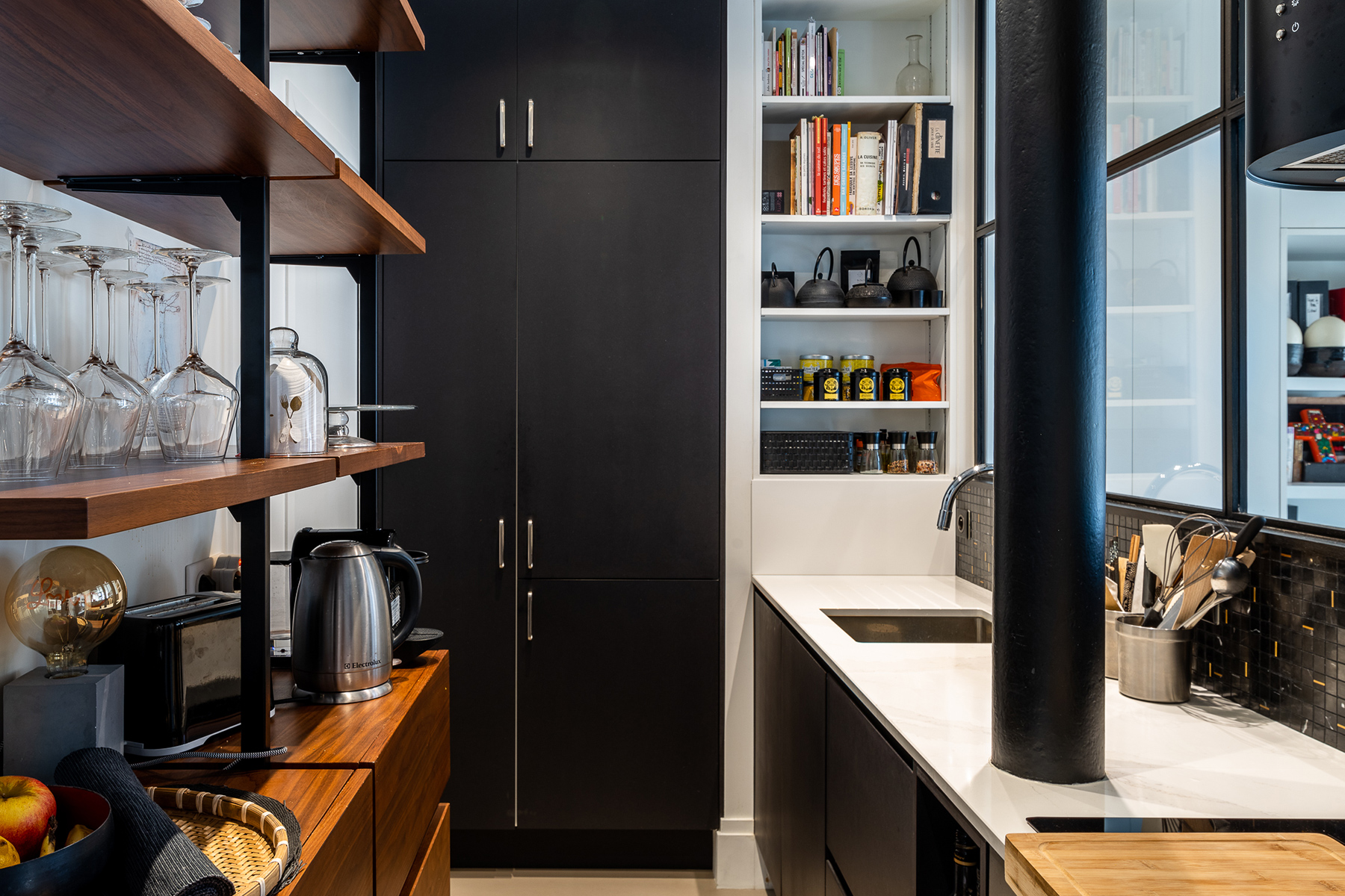 Au rez-de-chaussée, la pièce de réception et vie façon « cabinet de curiosités » (la façade en bois peinte en noire, des matériaux anciens, tons foncés, …)