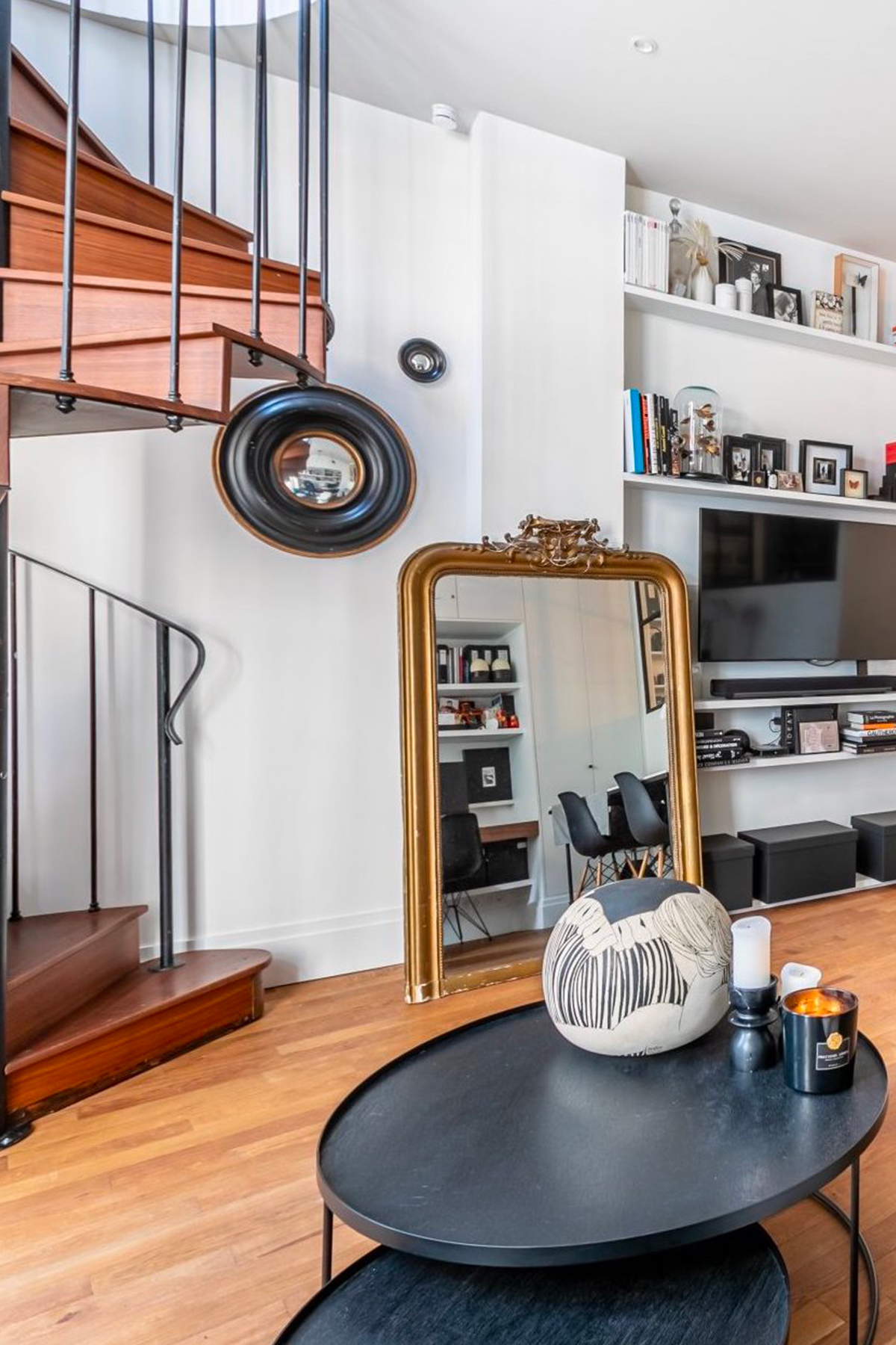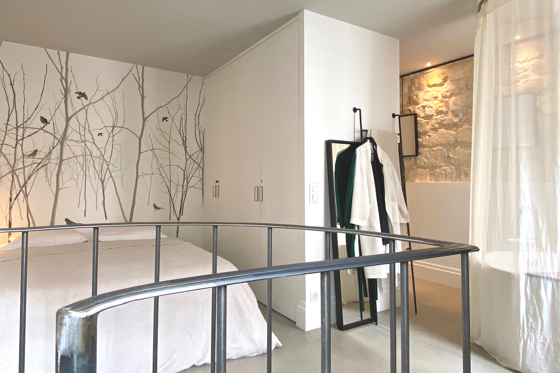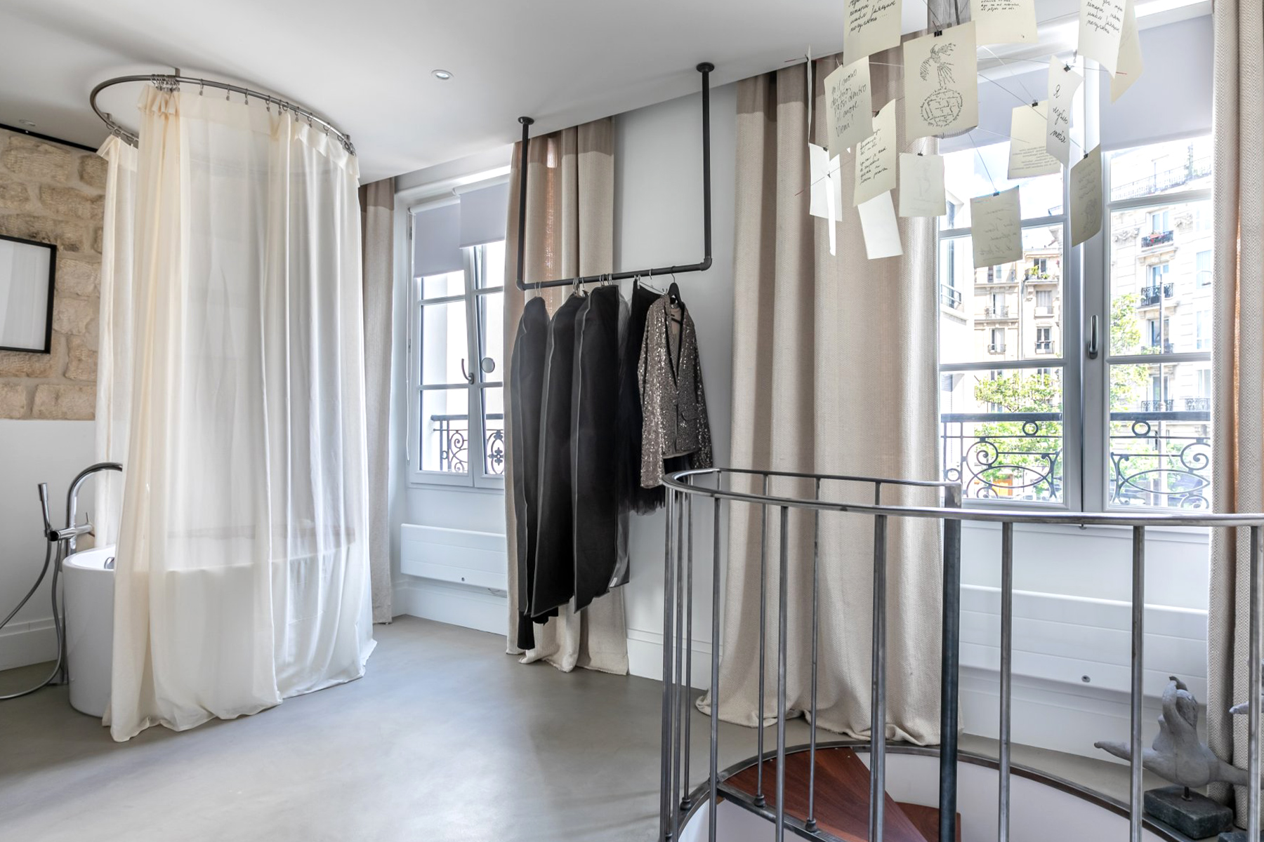 Ancienne mercerie devenue galerie d’art, aménagée en duplex, au pied d’un immeuble haussmannien.