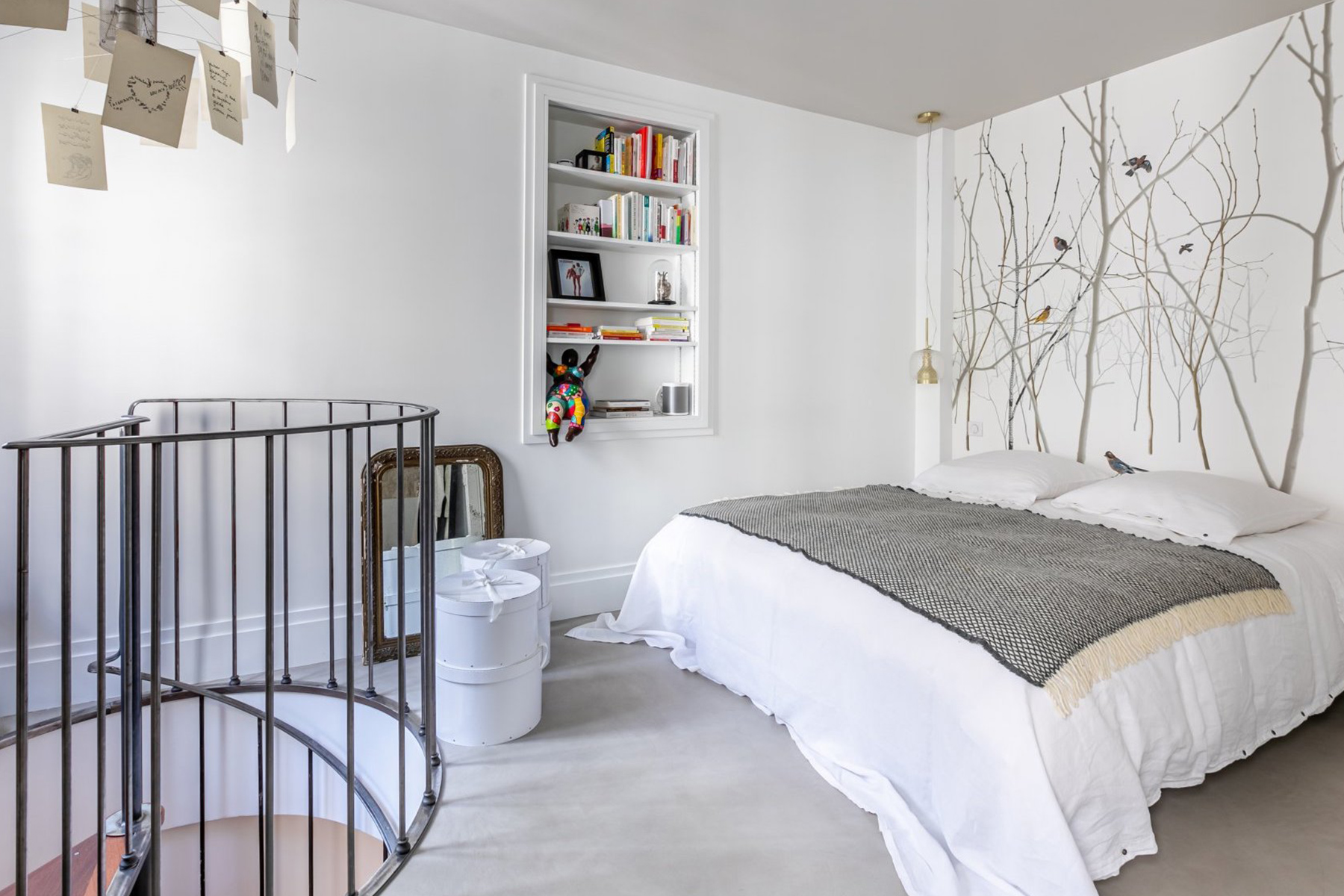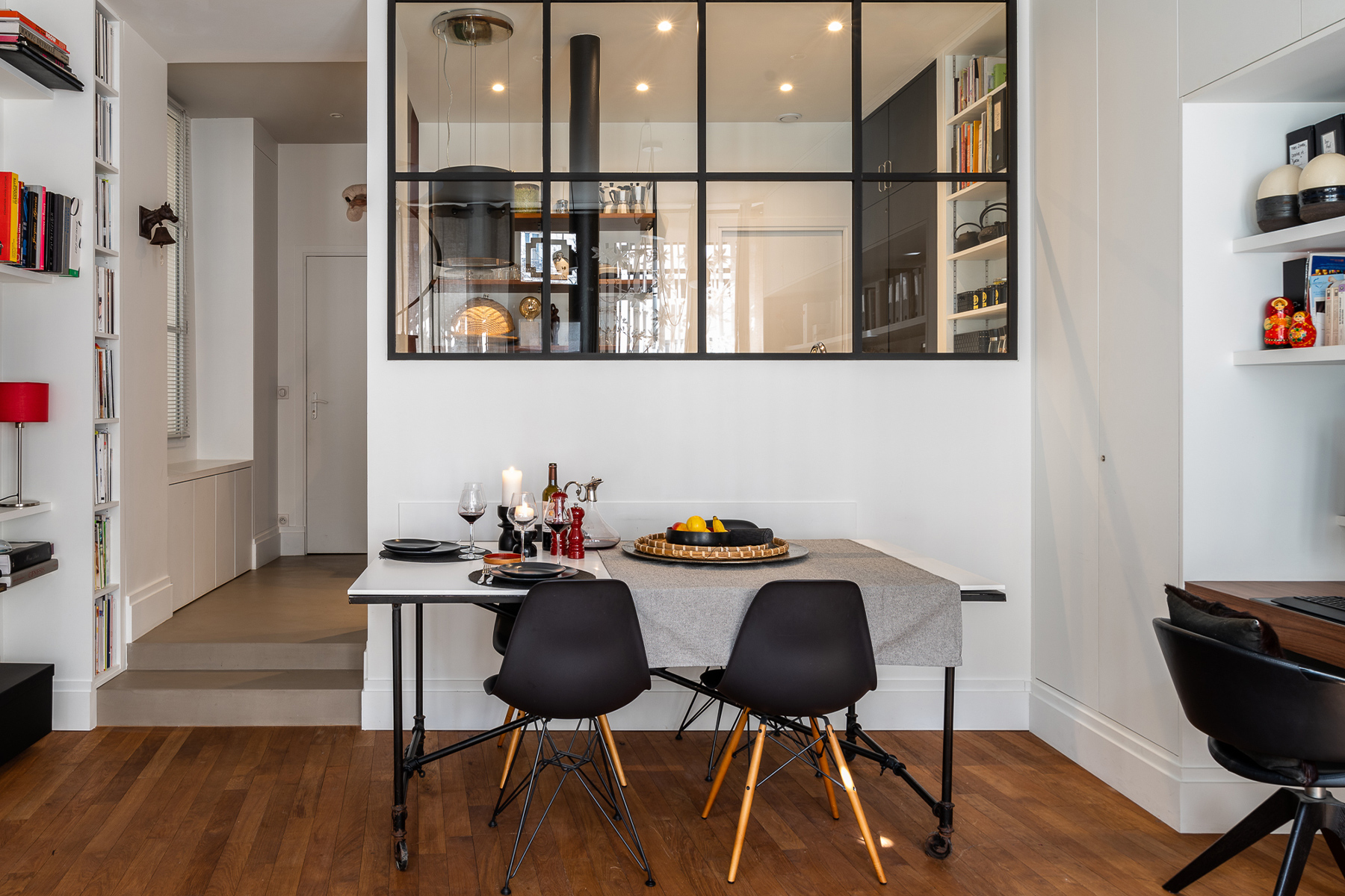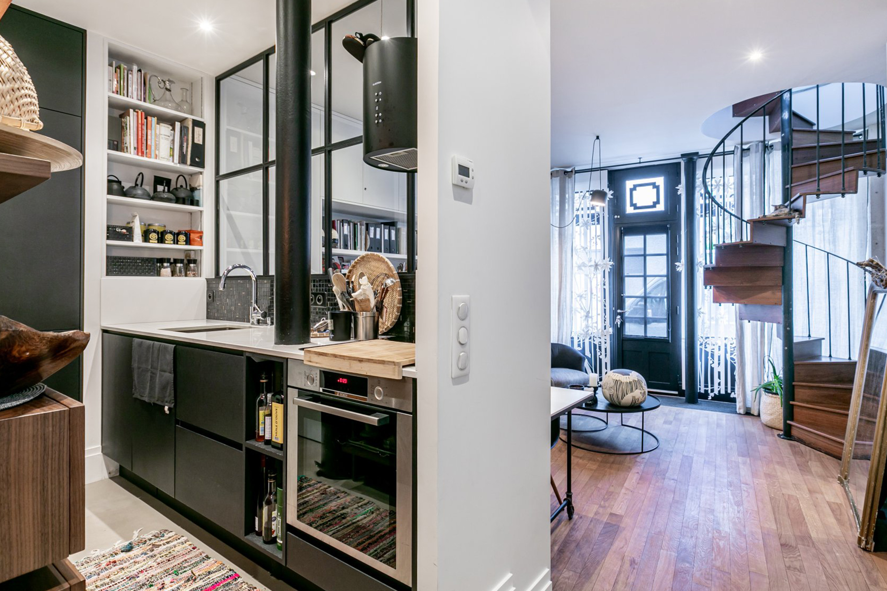 Ancienne mercerie devenue galerie d’art, aménagée en duplex, au pied d’un immeuble haussmannien.