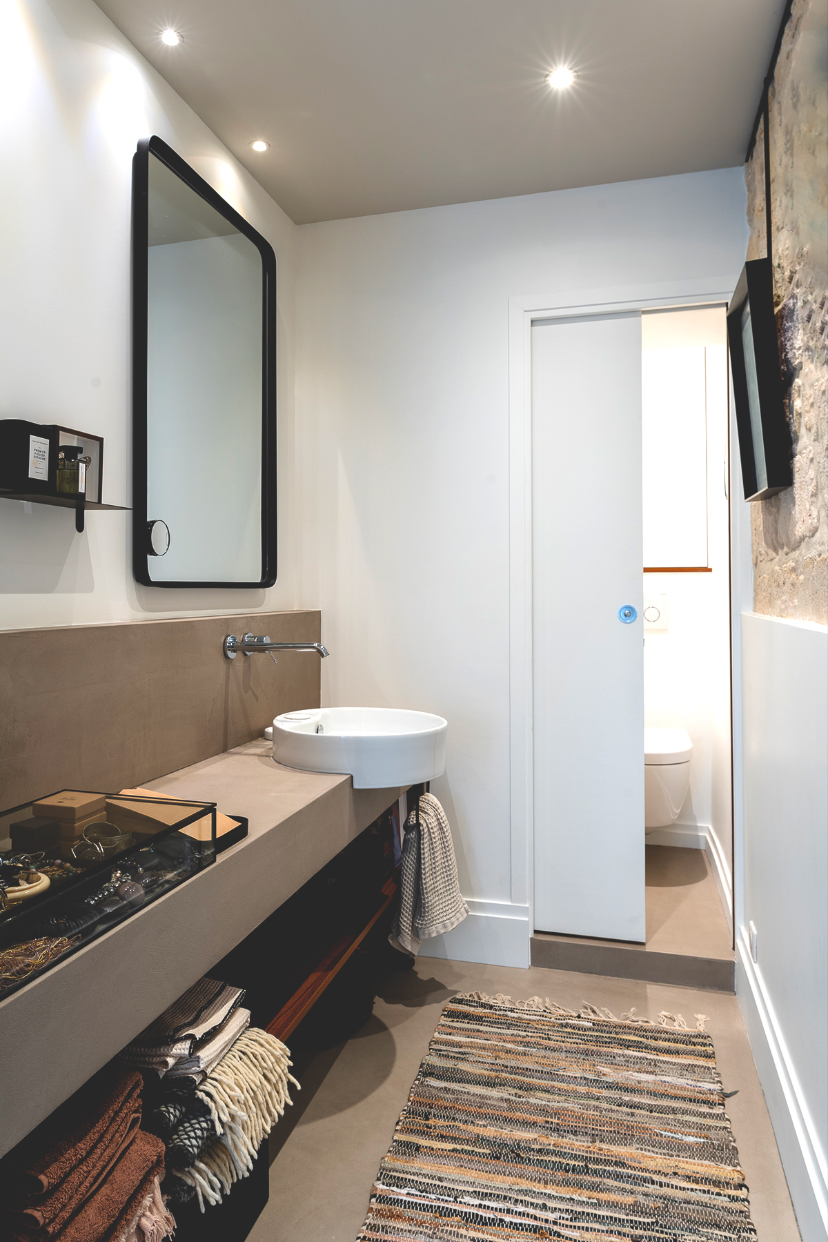Et à l’étage l’espace privé, en contraste, imaginé comme un cocon blanc et minéral, aux tons clairs et aux matériaux naturels (pierre, béton ciré, …).