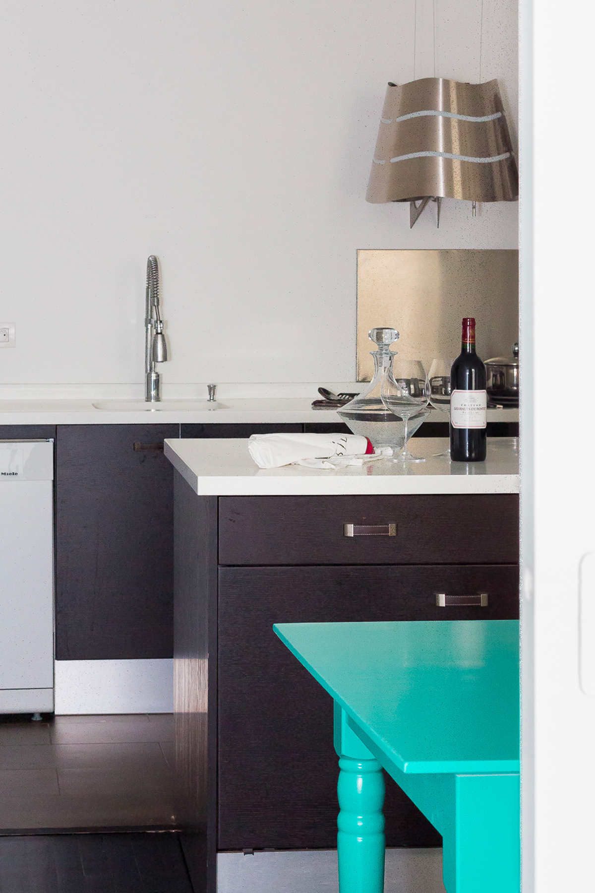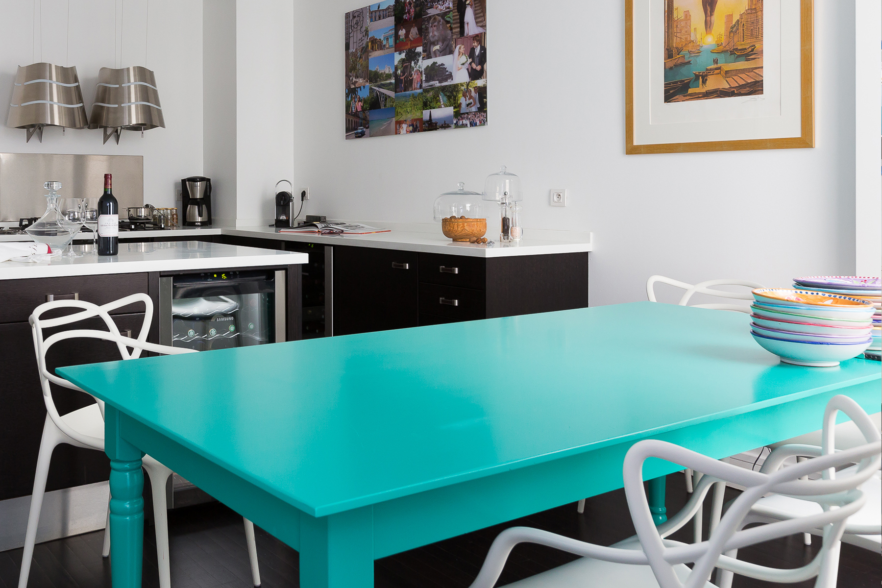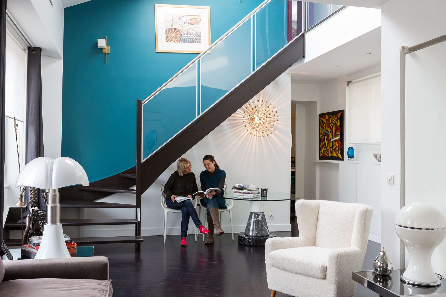 Traiter certains murs en couleur ou en papier-peint pour apporter une touche graphique et moderne, qui s’harmonisent bien avec les meubles et accessoires chinés par la cliente, grande amatrice de pièces rares.
