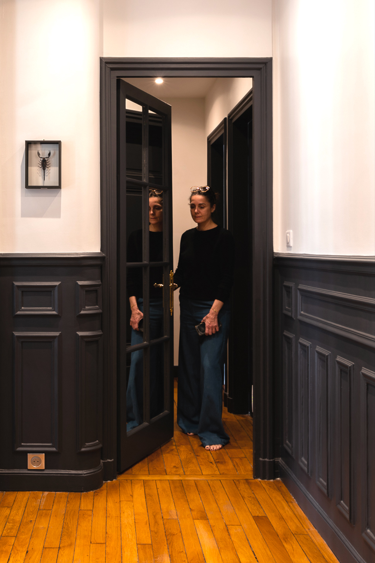 Le coloris gris éléphant Farrow & Ball, que l’on retrouve de façon récurrente (pour traiter les encadrements de portes, décors muraux, radiateurs, …) et autres accessoires assortis (rideaux, …), dans toutes les pièces de vie !